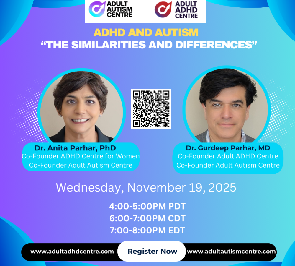 Join Adult Autism Centre & Adult ADHD Centre for a free, live webinar—ADHD and Autism: “The Similarities and Differences”—on Wednesday, November 19, 2025! Gain insights from Dr. Anita Parhar and Dr. Gurdeep Parhar as they explore the connections, similarities, and distinctions between ADHD and autism.